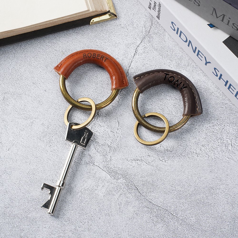 Deze gepersonaliseerde sleutelhanger staat voor minimalisme, met de algemene omtrek van een ring omwikkeld met leren decoratie, die perfect jouw persoonlijkheid laat zien. We bieden drie verschillende leerkleuren die bij jouw stijl passen. Je kunt je naam toevoegen om een uniek accessoire te maken dat het hoogtepunt van je rugzak of sleutelset wordt.