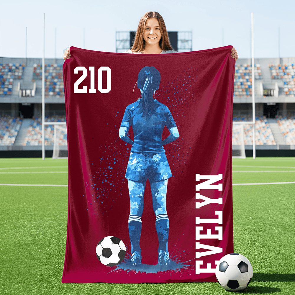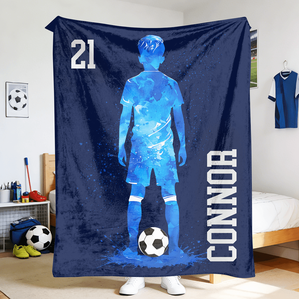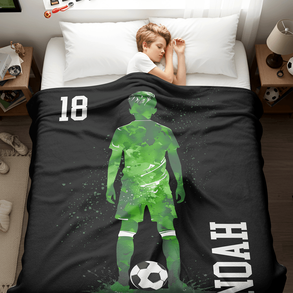 Deze voetbaldeken heeft een silhouetontwerp van een speler in aquarelstijl, aanpasbaar met je naam, rugnummer en achtergrondkleur naar keuze. Het artistieke spettereffect in combinatie met voetbalelementen zorgt voor een unieke, levendige look die zich onderscheidt van algemene ontwerpen.