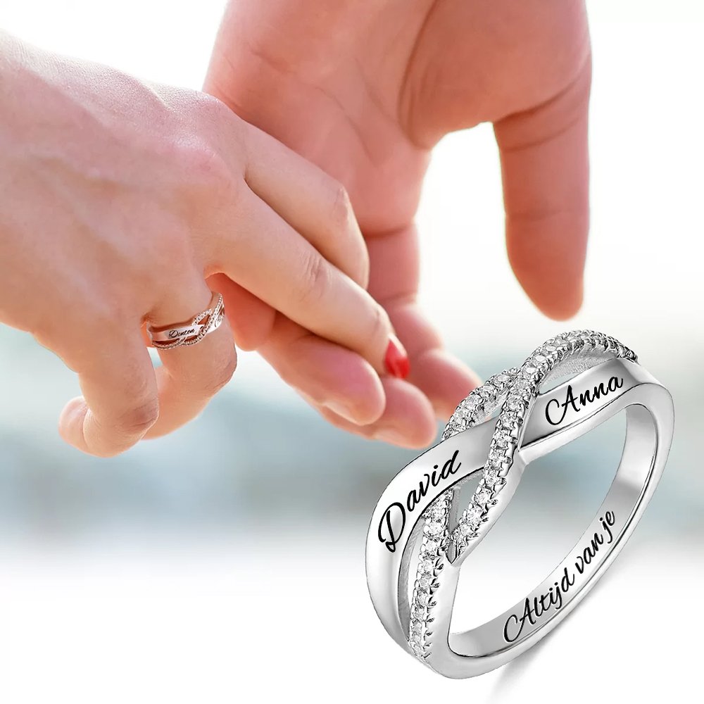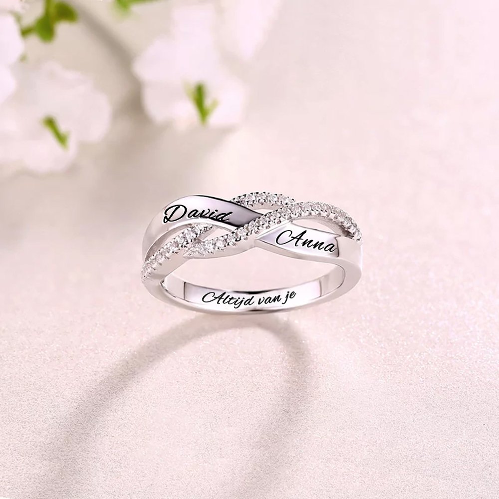 Deze elegante gedraaide ring met spiraalvormig design is een tijdloos sieraad. De witte stenen van gelijke grootte zorgen voor een subtiele en stijlvolle glans. Met gepersonaliseerde namen en een betekenisvolle tekst wordt deze ring een uniek cadeau dat liefde, verbondenheid en dierbare herinneringen symboliseert.