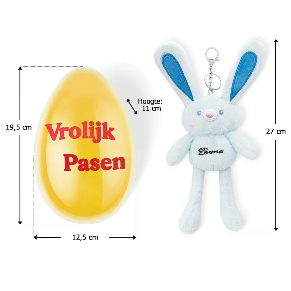 Deze set bestaat uit een schattige sleutelhanger met een pluche konijntje en een jumbo paasei. Je kunt verschillende stijlen kiezen, helemaal afgestemd op je wensen en voorkeuren. Om de sleutelhanger en het paasei nog persoonlijker te maken, bieden we personalisatie met tekst aan. Je kunt een naam of een korte wens doorgeven, en wij passen de tekst zorgvuldig aan op de sleutelhanger en het paasei.