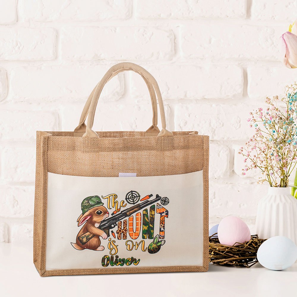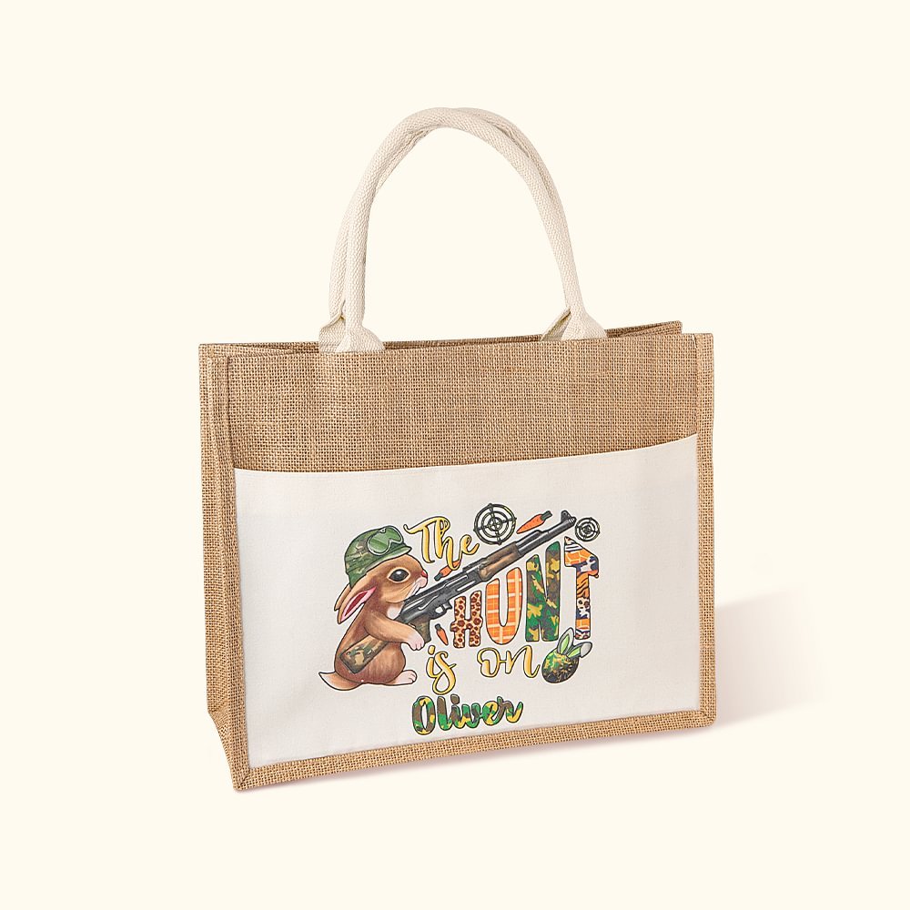Het konijnenpatroon op de draagtas geeft de vrolijke geest van Pasen weer. De boodschap "The Hunt Is On" is op de tas gedrukt, wat een feestelijk tintje geeft aan elk paasevenement of -bijeenkomst. Bovendien maakt de gepersonaliseerde naamoptie elke tas uniek.