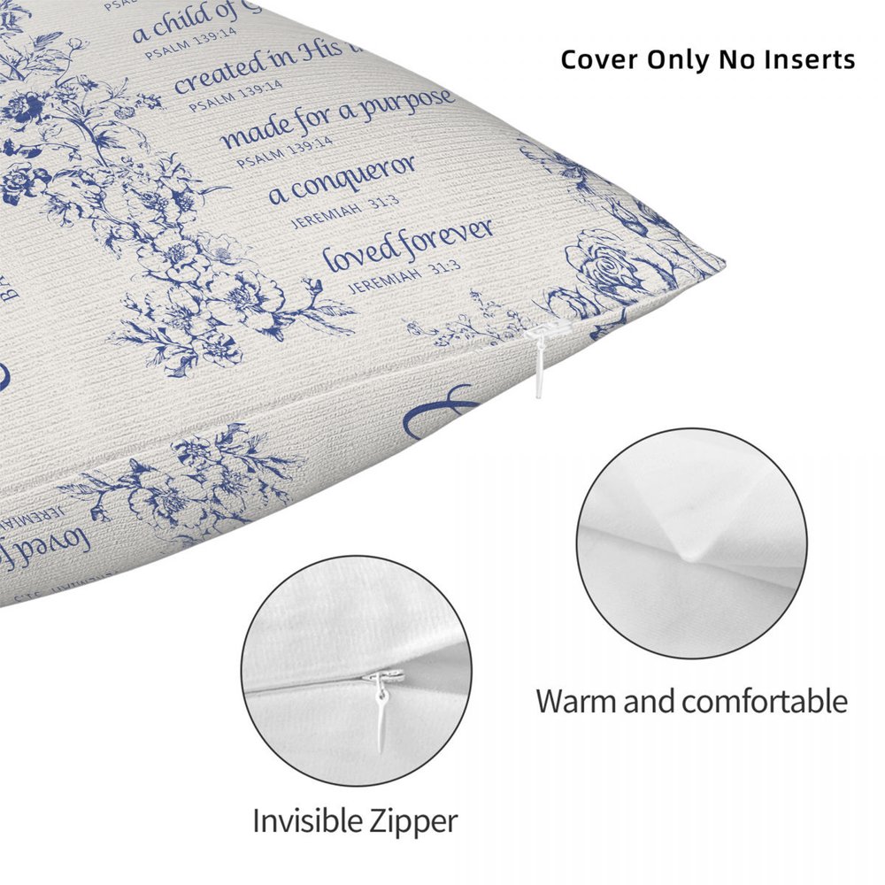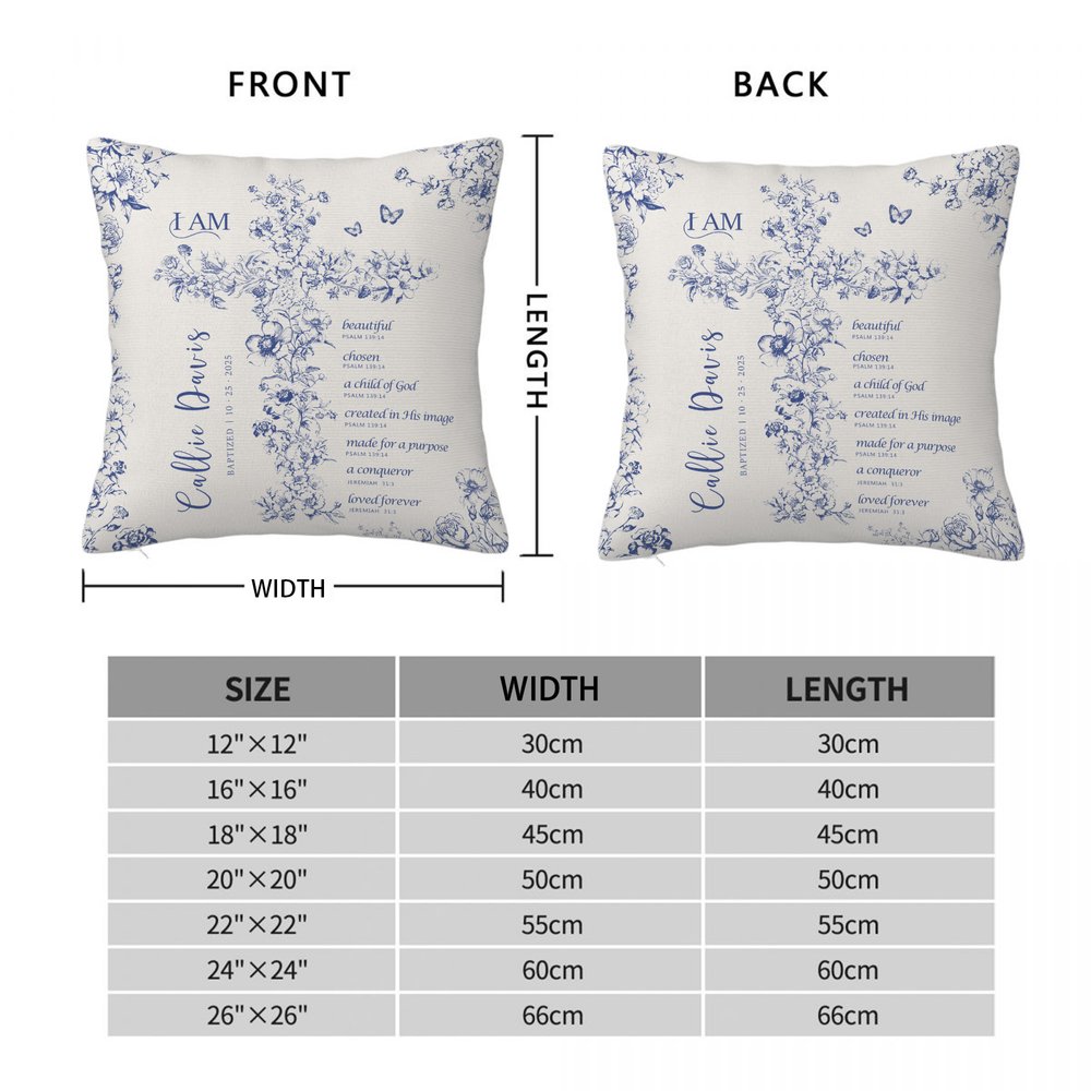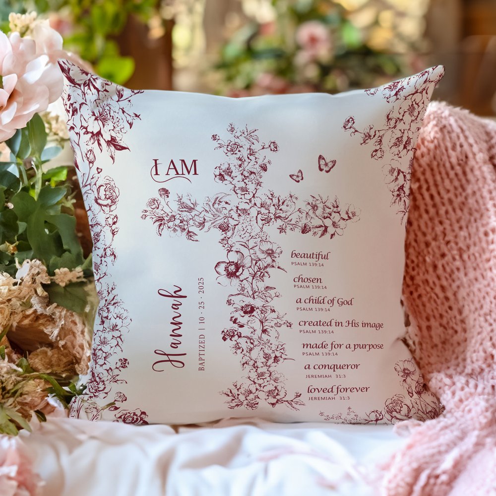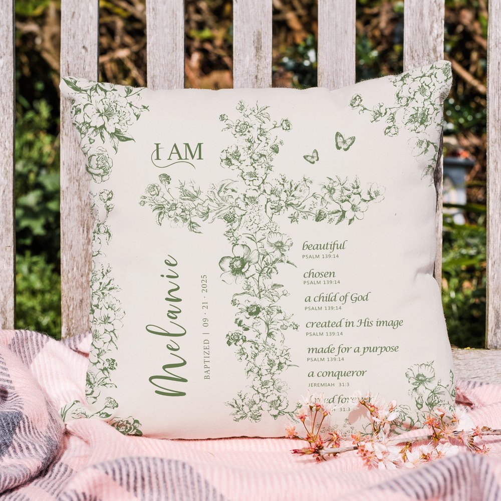 Dit sierkussen heeft een Toile de Jouy print geïnspireerd op een kruis met bloemen en straalt een vrome, pure elegantie uit. Speciale bijbelse zegeningen (zoals "Mooi" en "Uitverkoren") brengen de boodschap "Dit is Gods gekoesterde schat". Aanpasbaar met de naam van je kind en een speciale datum, dient het als een constante herinnering aan liefde en geloof, waardoor het een perfect aandenken is.