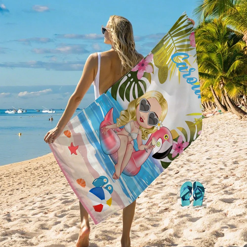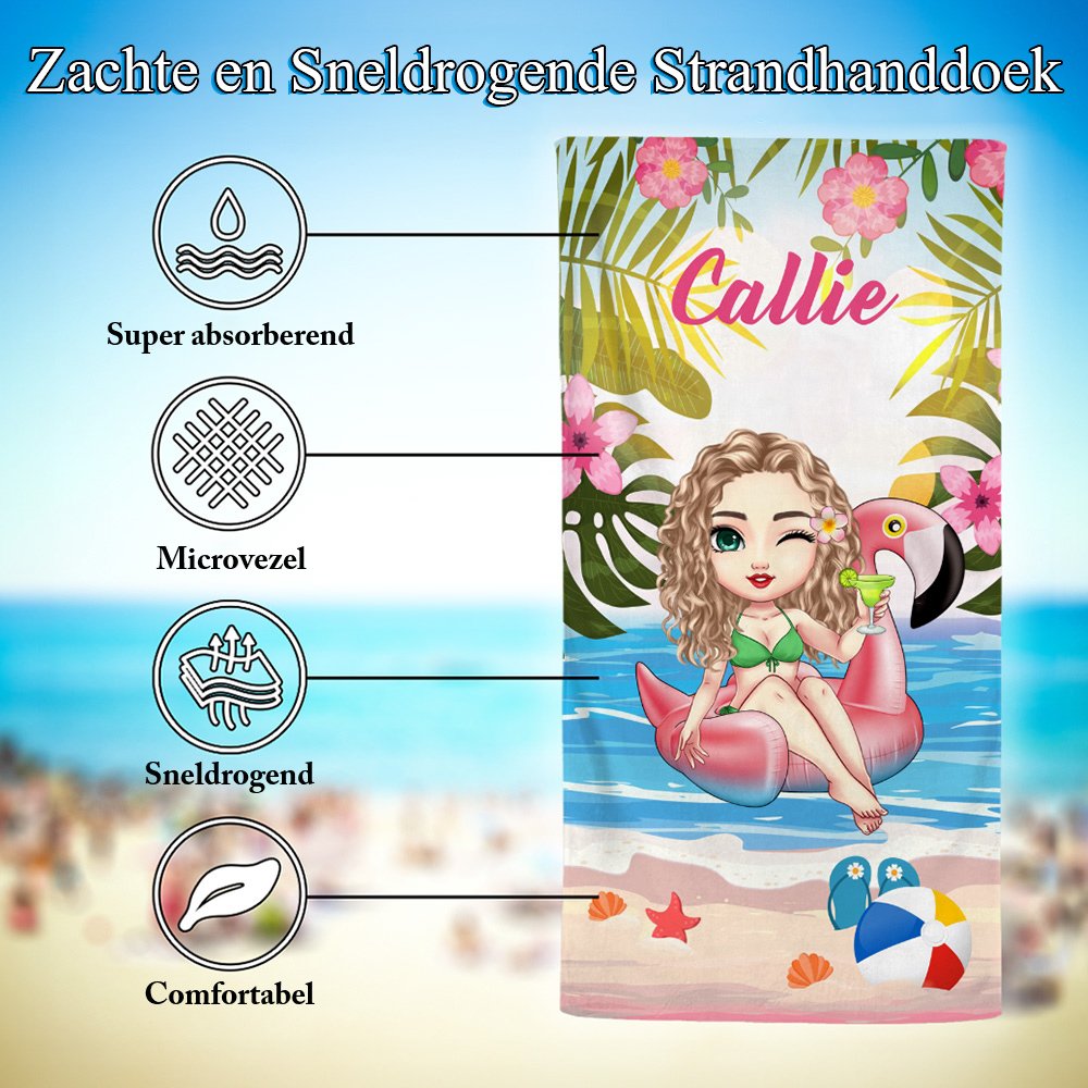 Het ontwerp van dit strandlaken is geïnspireerd op tropische planten en strandscènes en heeft een vrolijk, zomers design. Dit product biedt de mogelijkheid om cartoonfiguren voor alle leeftijden te personaliseren. Daarnaast kunnen persoonlijke afbeeldingen van favoriete drankjes en zwembandjes worden afgedrukt, zodat het strandlaken een unieke stijl krijgt. Laat je exclusieve naam afdrukken, met keuze uit 2 lettertypen en 4 kleuren, zodat elk strandlaken een persoonlijk en attent cadeau wordt.