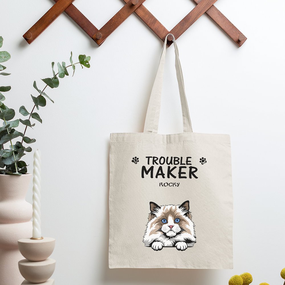Op de voorkant van de tas staat een hilarische en relateerbare quote met de tekst "Trouble Maker" en een speels portret van een hond of kat. Het zal zeker een glimlach op je gezicht toveren elke keer dat je hem gebruikt, en het zal zeker een gespreksstarter zijn waar je ook gaat.
