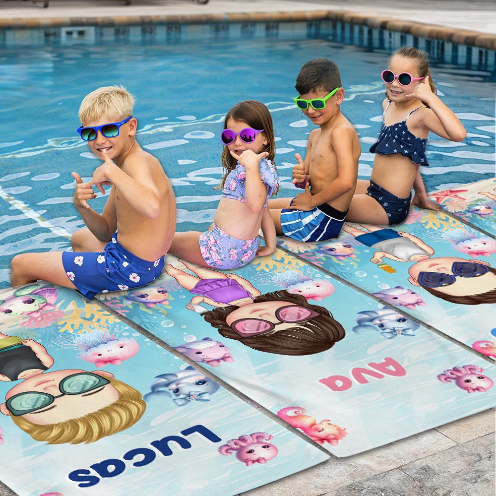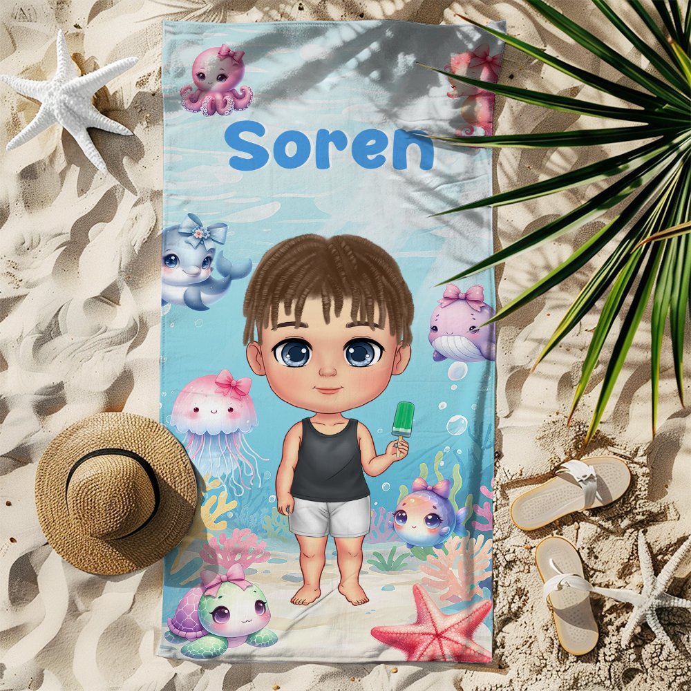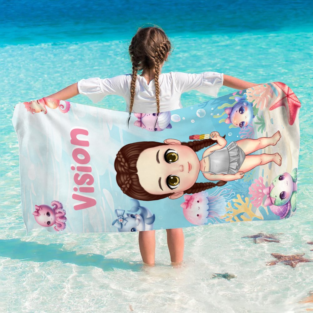 Dit strandlaken is bedrukt met levendige patronen van schildpadden, dolfijnen, kwallen en andere wezens die de onderwaterwereld tot leven brengen. Het kan worden aangepast met schattige stripfiguren voor jongens en meisjes en gekoppeld aan de naam van het kind. Je kunt verschillende kleurnamen kiezen. Het kleurrijke en leuke ontwerp kan de verbeelding en het geluk van kinderen inspireren.