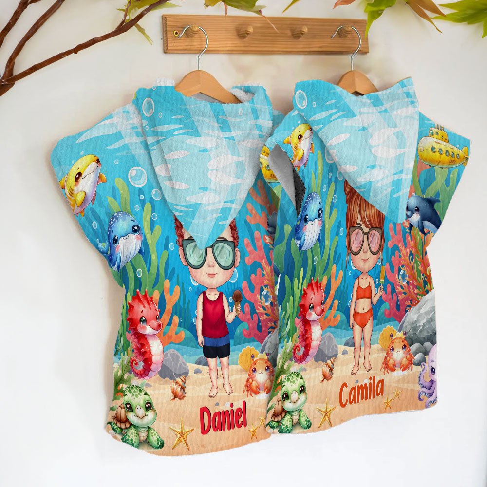 Met levendige illustraties van zeeschildpadden, dolfijnen, haaien, krabben en andere onderzeese wezens brengt dit strandlaken met capuchon de onderwaterwereld tot leven. Het kleurrijke en speelse ontwerp is perfect om de verbeelding en vreugde van kinderen aan te wakkeren, waardoor het een favoriet is voor zowel stranddagen als badtijd.
