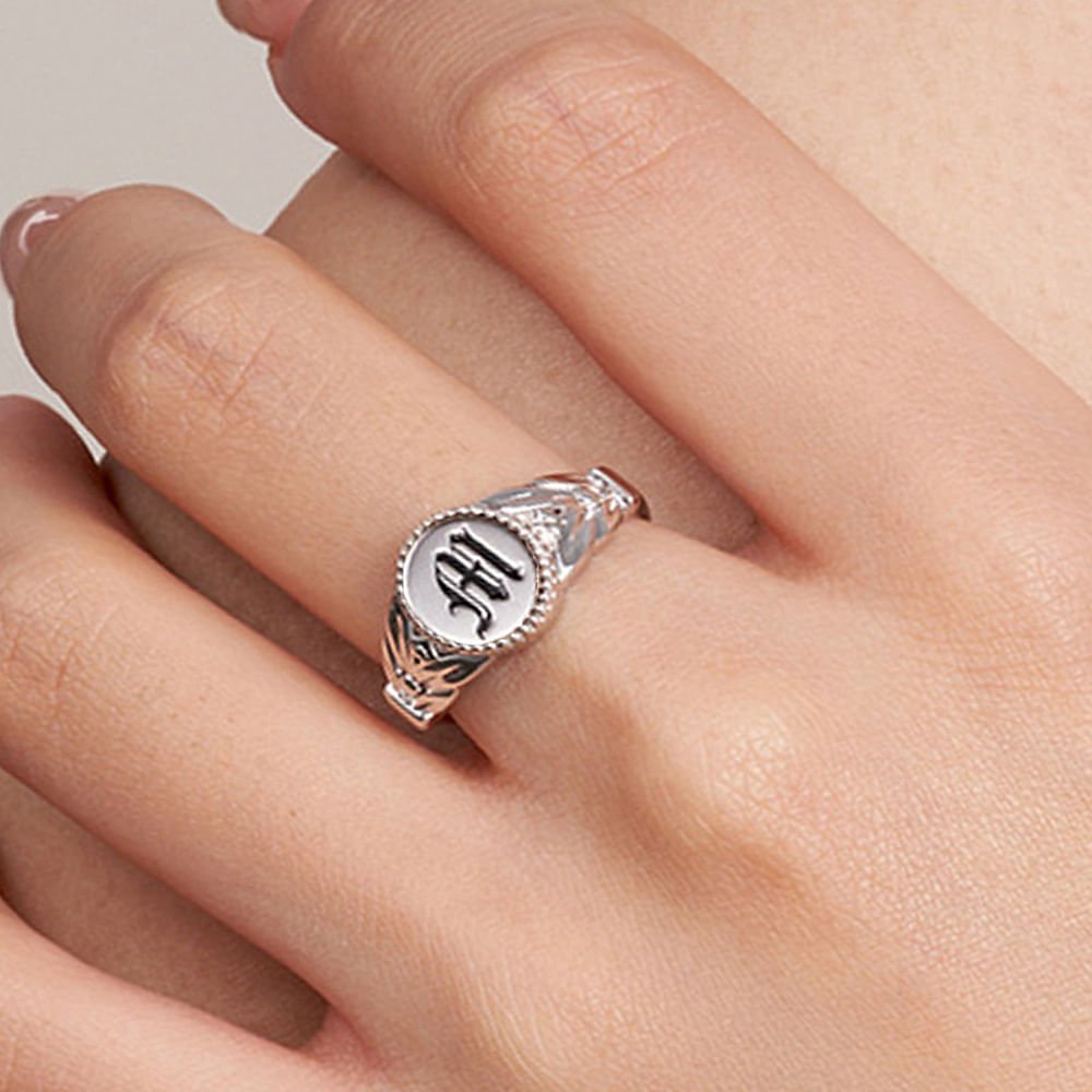 Je kunt je initialen aan de ring toevoegen en ons unieke oud-Engelse lettertype heeft een retro charme, waardoor de ring unieker wordt en exclusieve sieraden oplevert.