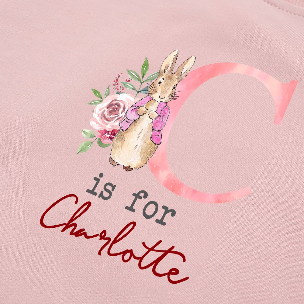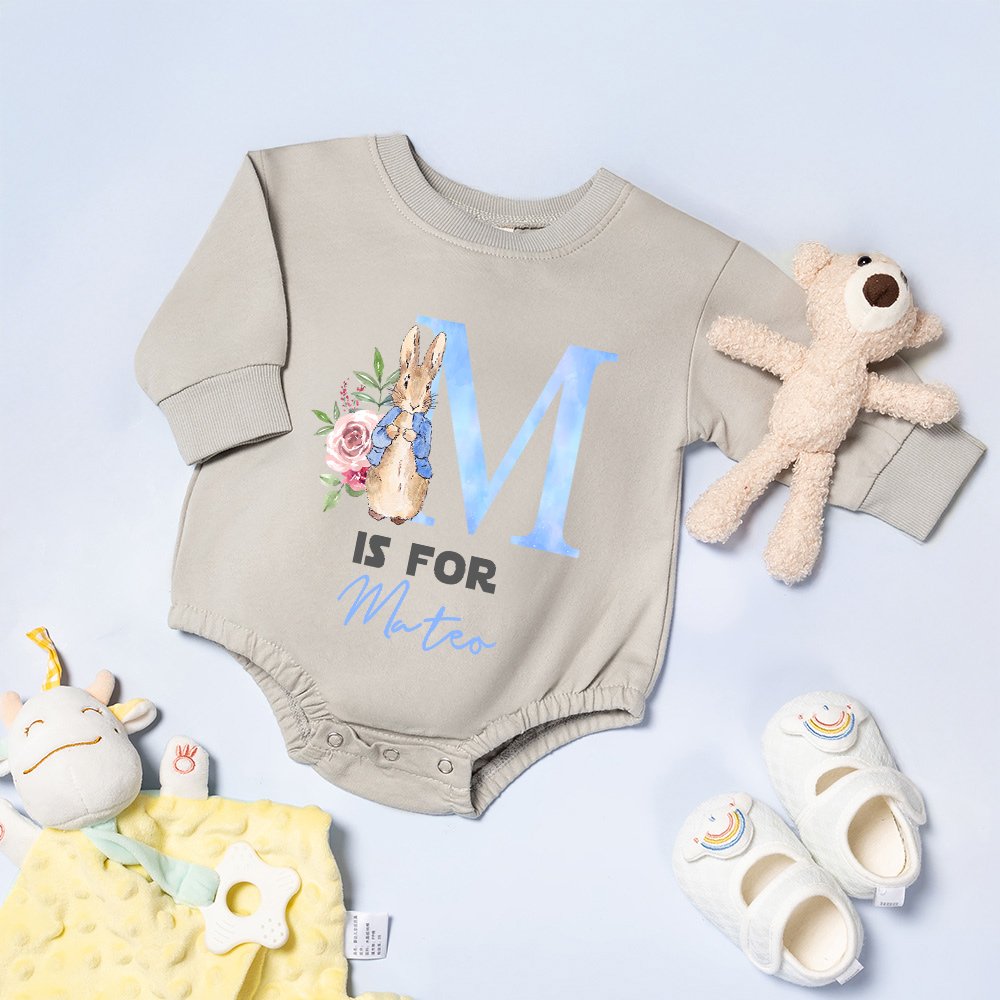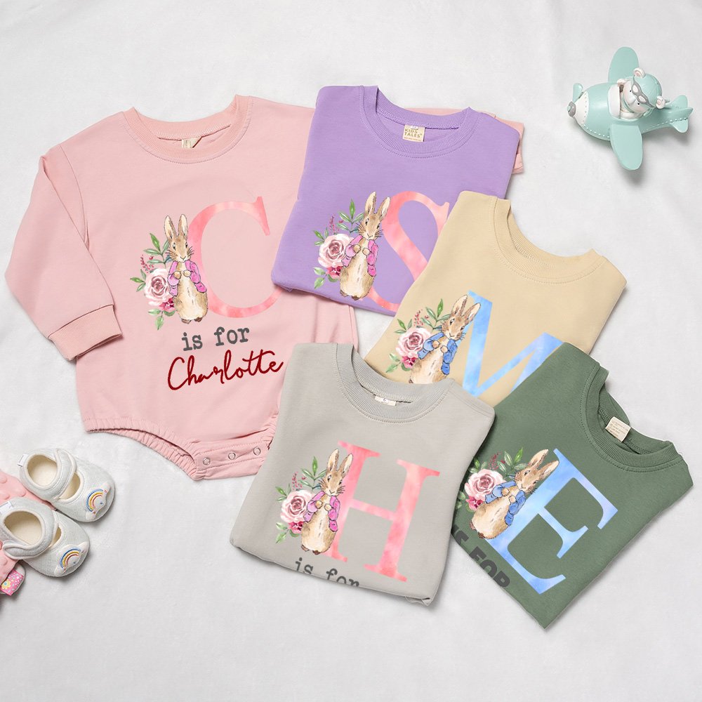 Dit rompertje heeft een aquarel konijntjesontwerp met bloemenversieringen, wat schattig en onschuldig is. Je kunt ook je naam en initialen personaliseren om een unieke outfit voor je kind te maken.