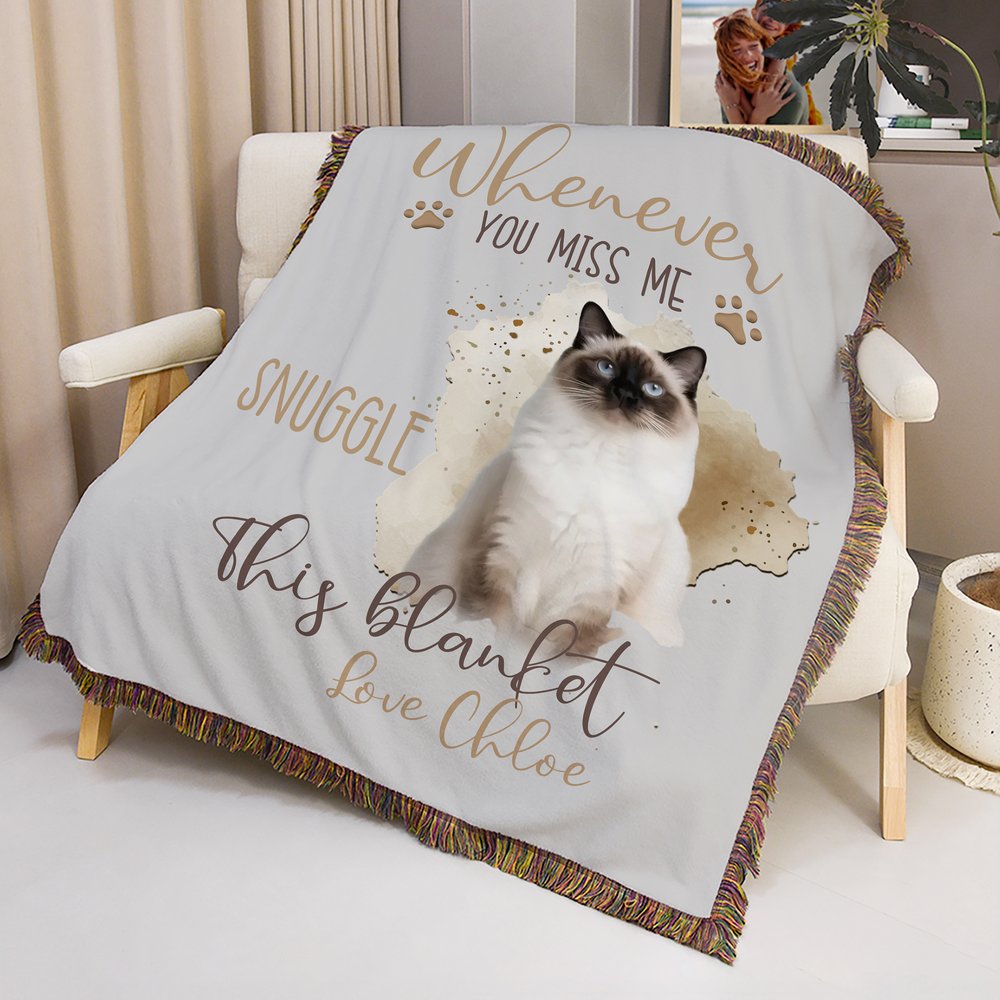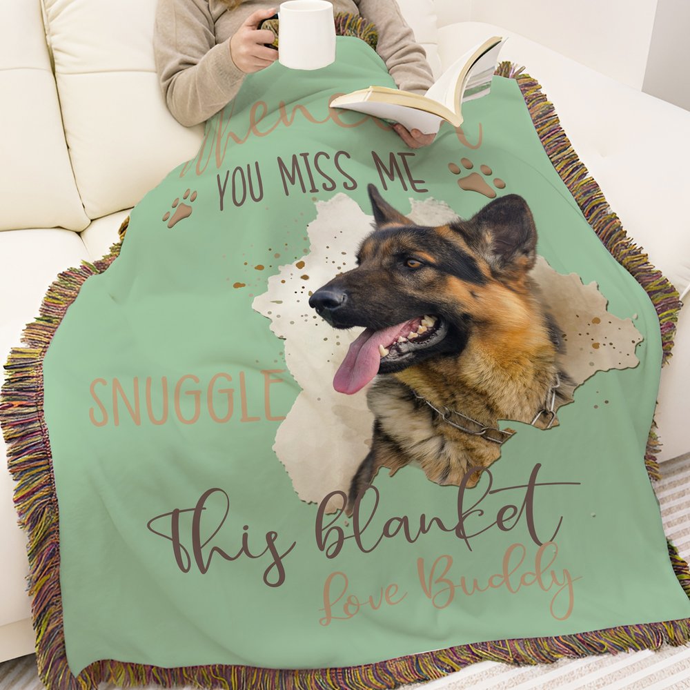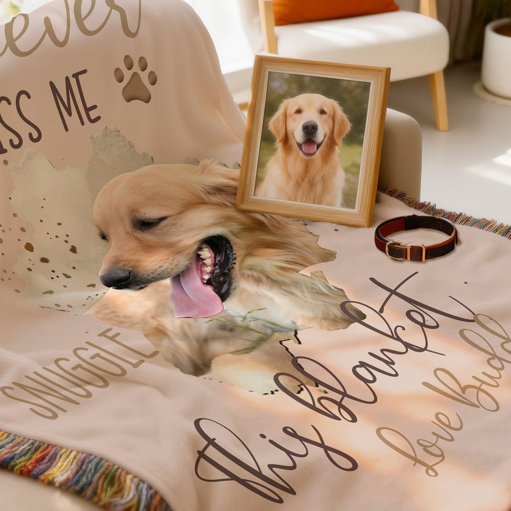 De deken heeft een warm, hartverwarmend ontwerp met een aquarelachtige foto van je huisdier in het midden, omringd door een zachte, neutrale achtergrond. De handgeschreven boodschap "Whenever You Miss Me Snuggle This Blanket" is gedrukt in aardetinten, gecombineerd met kleine pootafdrukken en de naam van je huisdier onderaan. De rand met franjes voegt een rustiek, gezellig tintje toe, terwijl het gedempte kleurenpalet een rustige, troostende sfeer creëert.