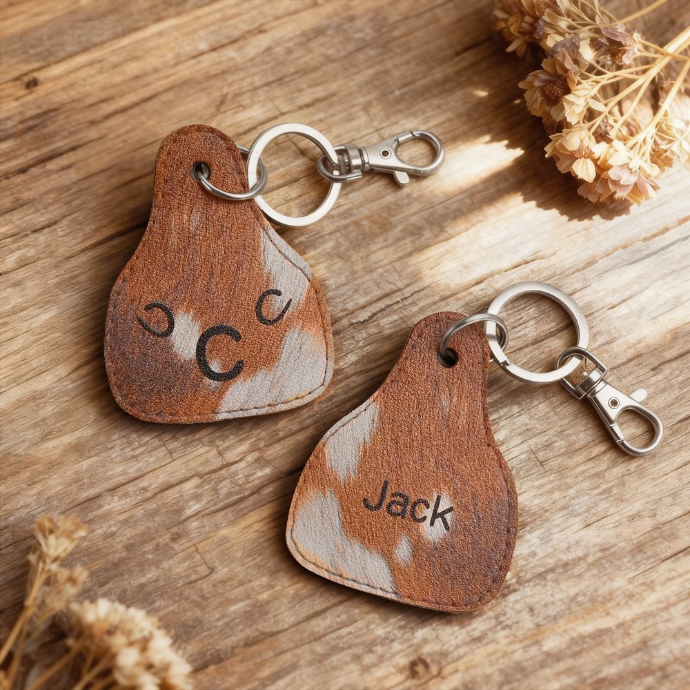 Met een ruige, bruine cowboybont textuurprint die de essentie van het Amerikaanse Westen weergeeft. Deze unieke sleutelhanger kan aan twee kanten gepersonaliseerd worden - de ene kant kan aangepast worden met een volledige naam, terwijl de andere kant een enkele initiaal weergeeft. Het rijke, tactiele oppervlak en de gepersonaliseerde elementen creëren een onderscheidend accessoire dat het westerse erfgoed in stijl viert.