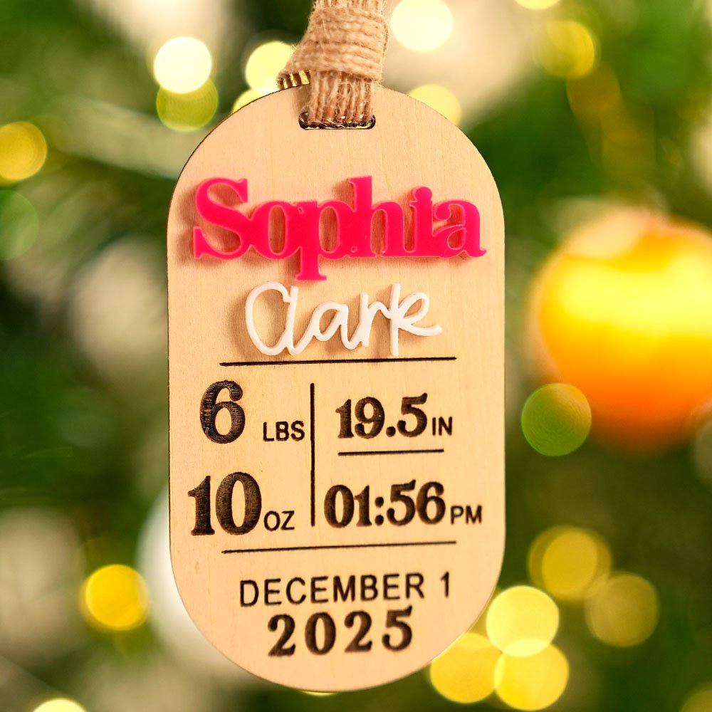 Dit ornament is ontworpen met het geboortekaartje van de pasgeborene als kernconcept. Het is zorgvuldig gegraveerd met de naam, het gewicht, de lichaamslengte, de geboortetijd en andere belangrijke gegevens van de baby, zodat elk detail een mooie herinnering voor de ouders wordt om te koesteren. De eenvoudige maar warme stijl maakt het tot een warme versiering in huis, die je voortdurend herinnert aan de gelukkige tijd dat je je baby voor het eerst zag.