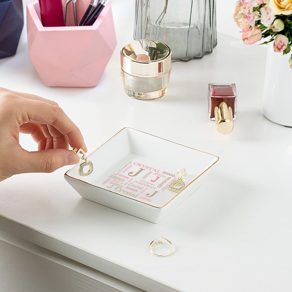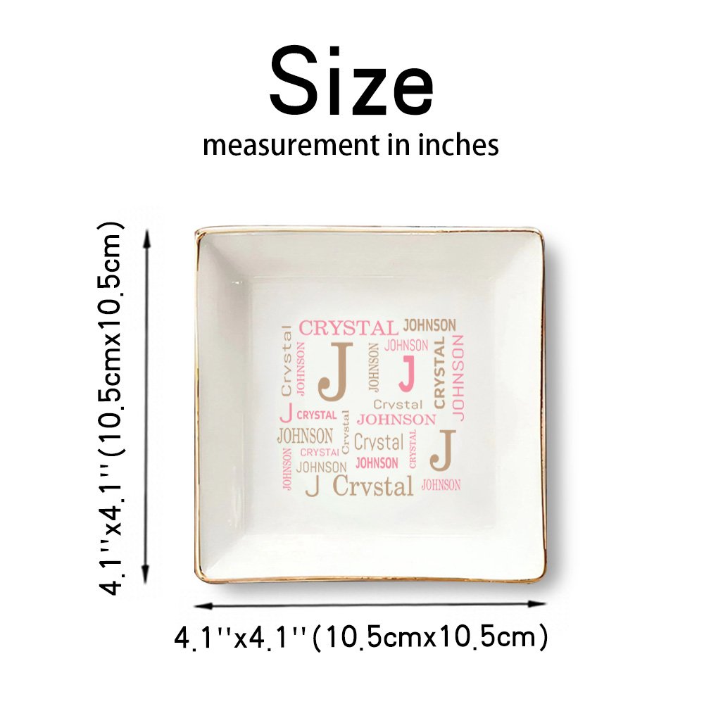 Dit juwelenbord met het woordwolkontwerp is verkrijgbaar in twee stijlen en zestien kleuren in goud, bruin, marineblauw of rood en je kunt het aanpassen met je initialen en naam, waardoor het een uniek cadeau wordt dat je zorg en zegeningen uitdrukt.