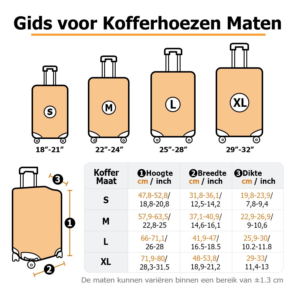 Er zijn vier maten beschikbaar, zodat bijna elke bagage erin past: Small: Past op 45,7 cm - 53,3 cm (18"- 21") koffer; Medium: Past op koffers van 55.9 cm - 61 cm (22" - 24"); Groot: Past op een koffer van 63,5 cm - 71,1 cm (25" - 28") ; X-Large: Past op koffers van 73,7 cm - 81,3 cm (29" - 32") . Raadpleeg de informatie over de bagagemaat en meet de hoogte, breedte en dikte van de koffer.
