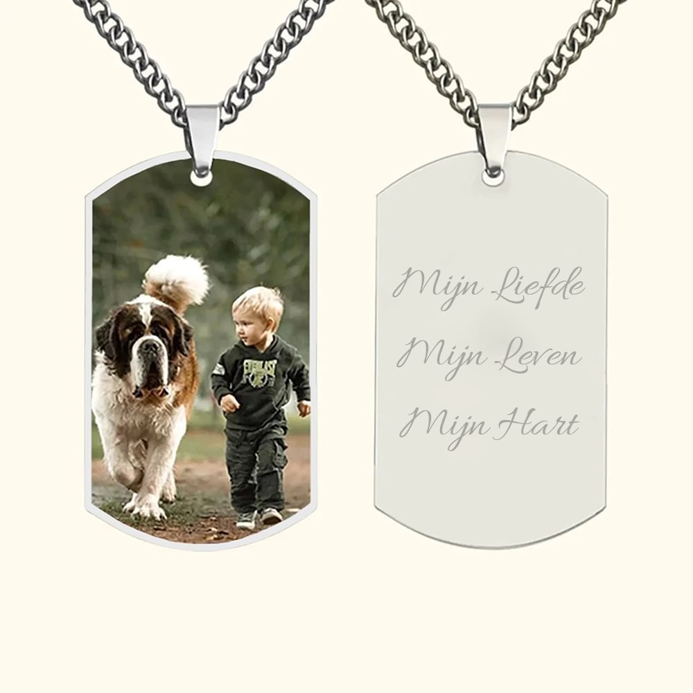 Deze door Callie bedrukte dog tag-hangerketting met foto straalt een tijdloze, klassieke stijl voor heren uit. Met dit speciale sieraad kunt u uw favoriete kunstwerk vereeuwigen en zo belangrijke momenten en herinneringen uit uw leven bewaren. Het graveren van woorden op de achterkant geeft het cadeau nog meer betekenis. Een betekenisvol cadeau voor uw vader, vriend of echtgenoot.