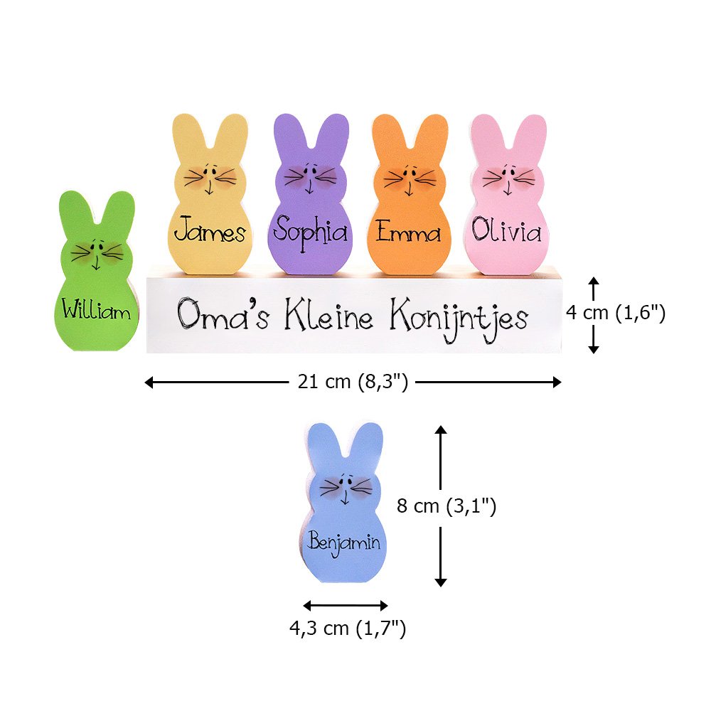 Op zoek naar het perfecte paascadeau? Deze betoverende blokjesset met konijntjes is een ideale keuze voor oma, opa, mama of papa. Het is een attente manier om hun familienamen te laten zien en een persoonlijk tintje aan elk feest toe te voegen. Of het nu gebruikt wordt als feestelijke decoratie of als betekenisvol cadeau, deze set maakt elk paasfeest echt speciaal.