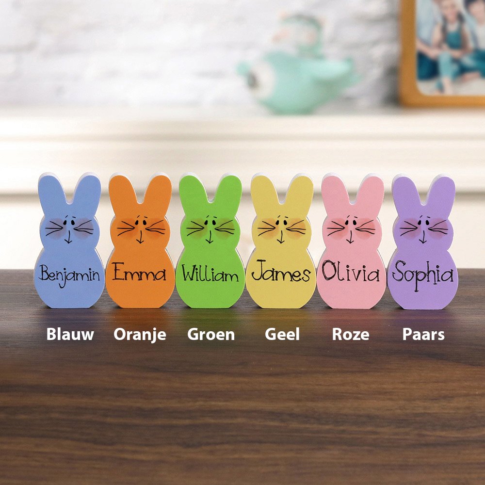 Vier de vreugde van Pasen met onze prachtige Paashazen Houten Blokkenset - een unieke en hartverwarmende toevoeging aan je interieur. Met zes levendige kleuren voegt elk konijntje kleur en charme toe aan je interieur. Met de mogelijkheid om tot 15 konijntjes en eigen namen te personaliseren, kun je een unieke display maken die het verhaal van je familie vertelt.